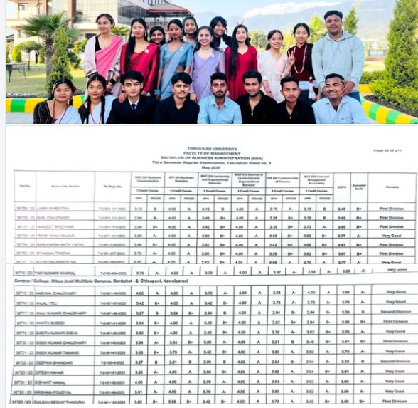 त्रिभुवन विश्वविद्यालय व्यवस्थापन संकाय द्वारा प्रकाशित BBA 3 rd सेमेस्टरको नतिजामा यस क्याम्पसकी छात्रा आश्मा चौधरीले ३. ९५ जि .पी. ए .सहित उत्कृष्ट नतिजा ल्याउन सफल भएकोमा र सत प्रतिशत विद्यार्थीहरु उत्तीर्ण भएकोमा हार्दिक बधाई तथा शुभकामना व्यक्त गर्दछौं। दिव्य ज्योति बहुमुखी क्याम्पस परिवार